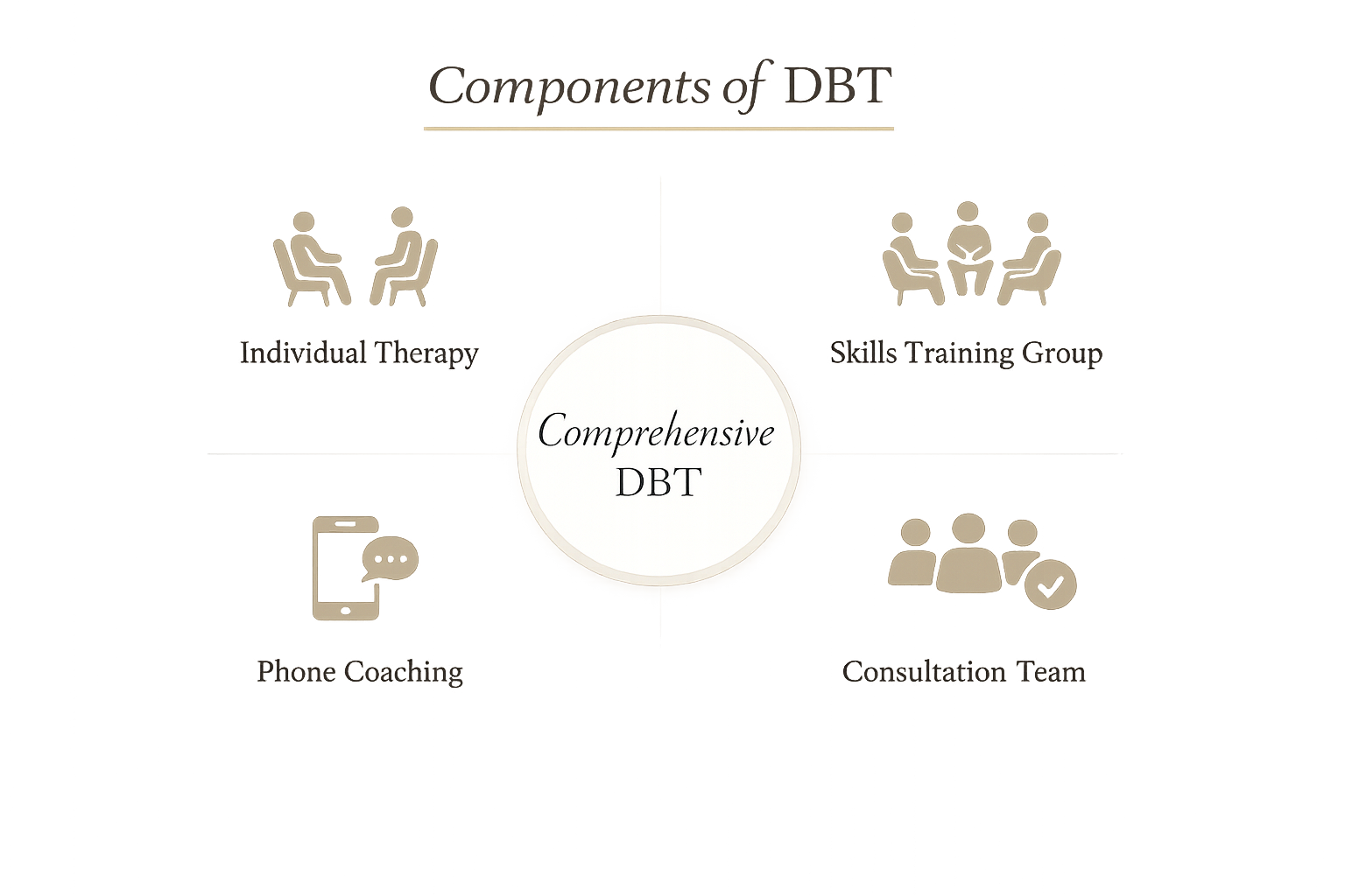 Comprehensive Dialectical Behavior Therapy (DBT) is a structured, evidence-based treatment designed to help individuals manage intense emotions, reduce harmful behaviors, and build a life that feels more stable and meaningful. It is often recommended for people struggling with emotional dysregulation, self-harm or suicidal thoughts, repeated hospitalizations, or challenges related to diagnoses such as depression, anxiety, PTSD, bipolar disorder, eating disorders, substance use, or Borderline Personality Disorder (BPD).